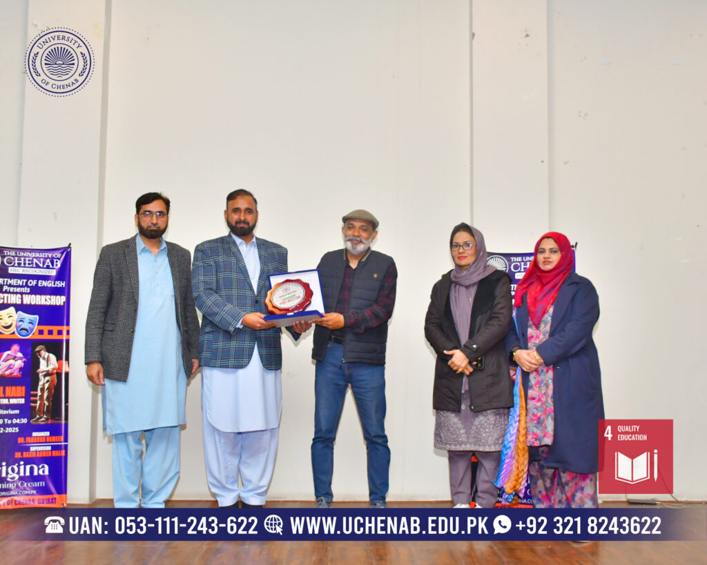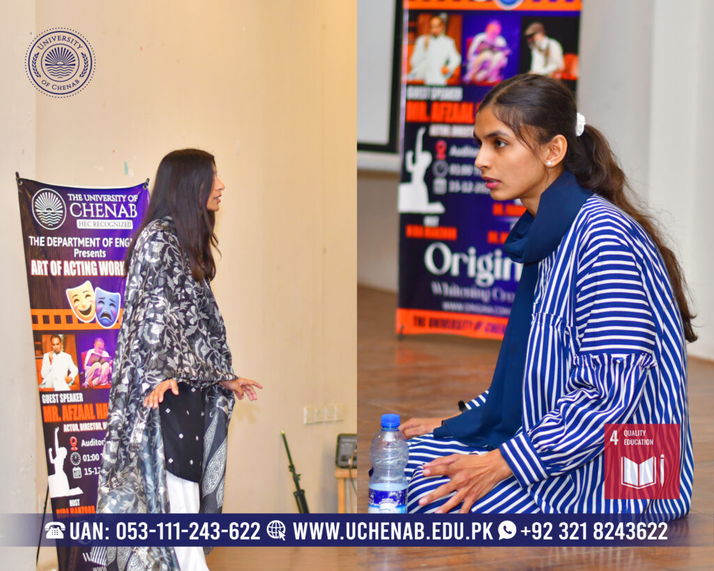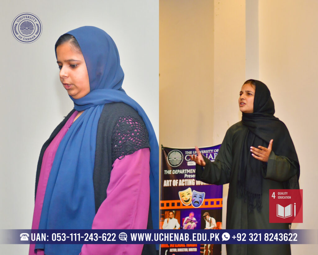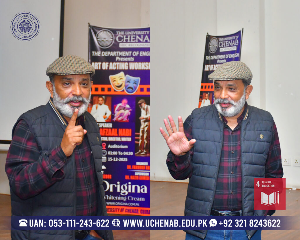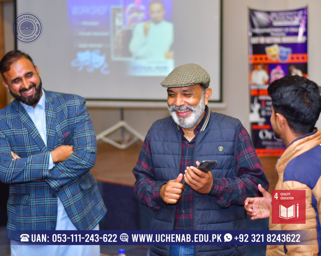 The University of Chenab organized the Art of Acting Workshop 2025 to promote creative expression and performance skills. This engaging workshop aimed to strengthen confidence, creativity, and stage awareness among participating students. Moreover, the session reflected UChenab’s dedication to nurturing artistic and expressive abilities. The workshop began with an interactive introduction led by Dr. Farukh Hameed. Initially, participants explored fundamental concepts of acting and performance discipline. Later, students practiced basic techniques related to expression, posture, and voice modulation. Consequently, the environment encouraged active participation and creative exploration.