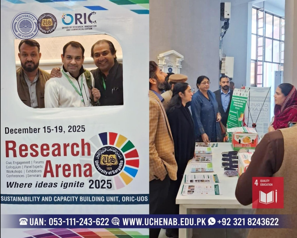 Research Arena 2025 marked a significant academic milestone for The University of Chenab. UChenab conducted an academic visit to the University of Sargodha with scholarly enthusiasm. This initiative promoted academic exchange and strengthened inter-university collaboration. Moreover, the visit encouraged meaningful research discourse among participating institutions. The academic delegation joined Research Arena 2025 under structured academic planning. Faculty members actively engaged in research-oriented discussions and presentations. Furthermore, participants explored diverse research themes across multiple academic disciplines. Such exposure enhanced understanding of contemporary research trends and methodologies.