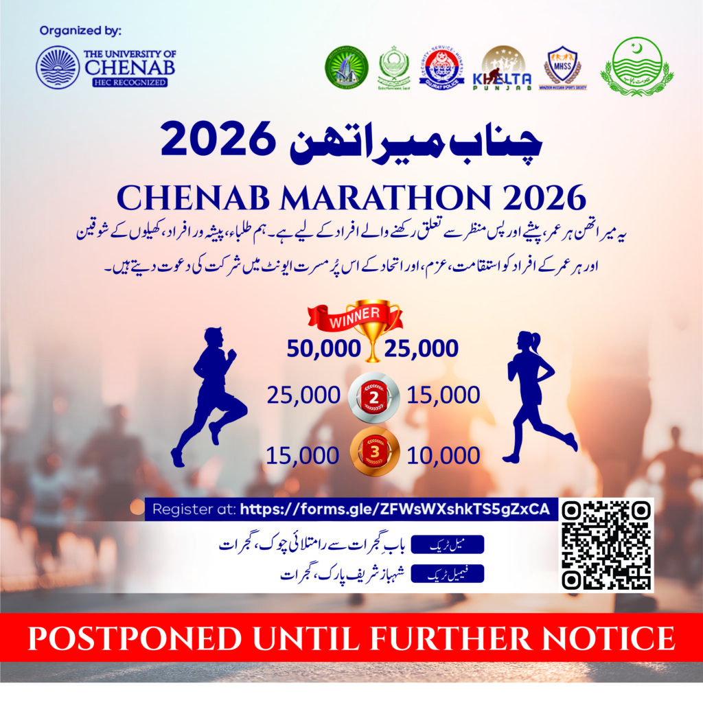 Register now as racer for Chenab Marathon 2026, organized by The University of Chenab Gujrat under the CM Punjab Initiative “Khelta Punjab”.